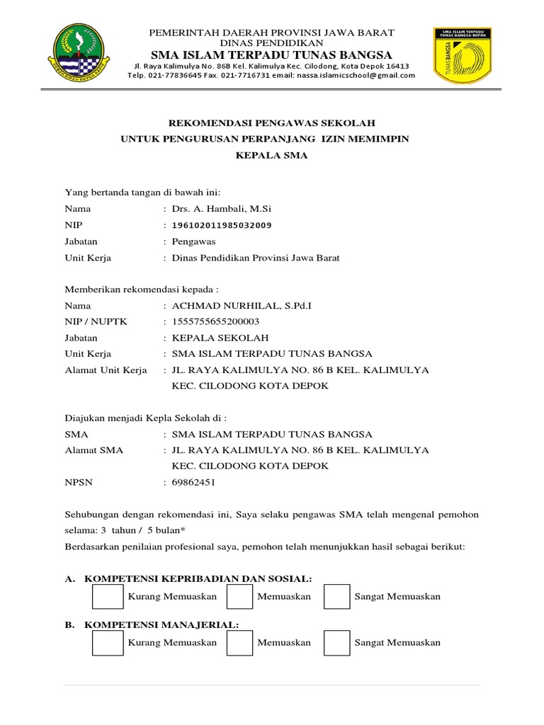 Berhasil atau tidaknya sebuah lembaga pendidikan khususnya pada satuan pendidikan akan sangat dipengaruhi oleh kompetensi yang dimiliki kepala sekolah tersebut. Surat ini dipergunakan ketika seorang karyawan tidak bisa masuk kerja sebagaimana biasanya. Instrumen penilaian kinerja (pk) kepala sekolah : Empati terhadap masalah yang dihadapi warga sekolah. Surat permohonan izin memimpin tandatangan kepala yayasan 2.