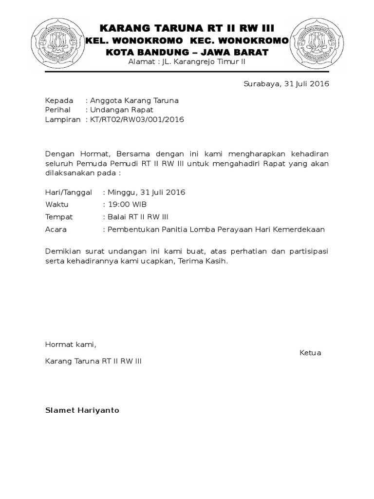 Contoh Surat Undangan Rapat, Resmi, Pernikahan, Kegiatan ... from i2.wp.com Umumnya, karang taruna diikuti oleh anak muda yang ada di desa setempat dan mengadakan berbagai macam kegiatan yang berguna untuk nah, karang taruna ketika akan merencanakan acara dan persiapan, pastinya membutuhkan rapat terlebih dahulu. Dalam wilayah desa, biasanya membawahi. Oleh karena itu kami mengharap kehadiran bapak/ibu seluruh perangkat desa ronggo pada rapat. Karang taruna dibentuk untuk menampung berbagai aspirasi masyarakat/warga. Surat undangan sendiri terdiri dari surat undangan resmi dan surat undangan tidak resmi. Organisasi siswa intra sekolah (osis) sman 1 jakarta jalan budi utomo no.7. Contoh surat undangan rapat karang taruna. Contoh surat undangan karang taruna.