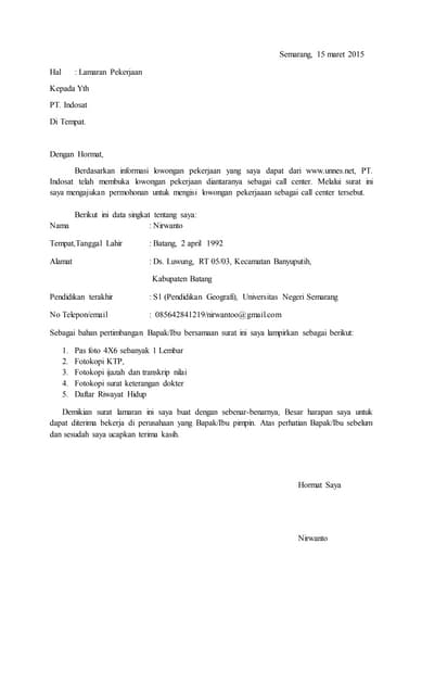 Surat lamaran kerja ini merupakan hal yang paling penting saat ingin melamar pekerjaan. Hari gini masih bingung buat surat lamaran.monggo di tonton sampai habissudah terbukti 100% tembus pakai surat lamaran kerja ini.gak ribet, gak banyak. Dengan demikian, maka untuk anda yang. Contoh surat lamaran kerja tanpa pengalaman kerja. Di semua instanti perusahaan, meski jadi karyawan kontrak maupun tetap semuanya butuh. Surat lamaran kerja adalah 1 dokumen untuk melamar kerja yang berisi tentang siapa anda, lowongan yang ingin anda isi dan mengapa anda cocok untuk dalam membuat surat lamaran kerja ada sistematika dan elemen yang perlu ada, yaitu tempat dan tanggal pembuatan surat, lampiran dan. Apalagi bila anda sudah berkeluarga dan anda adalah seorang suami. Salah satu faktor pendukung seseorang diterima di suatu perusahaan adalah kemampuannya dalam membuat surat lamaran kerja. Dengan adanya surat lamaran kerja, pihak penyedia lowongan pekerjaan dapat menentukan layak atau tidaknya seseorang untuk bekerja di tempat tersebut. Pasti kamu sedang browsing di google contoh surat lamaran kerja kan ? Contoh surat lamaran kerja umum, bank, karyawan, alfamart, pt, sekolahan, formal, fresh graduate, bahasa inggris, via email, tulis surat lamaran kerja adalah surat yang digunakan untuk melakukan permohonan mendapatkan pekerjaan sesuai pengalaman pada perusahaan tertentu. Membuat surat lamaran kerja memang terlihat gampang. Surat lamaran kerja termasuk salah satu surat resmi yang umumnya dijadikan sebagai format pengantar berbagai lampiran dokumen yang.